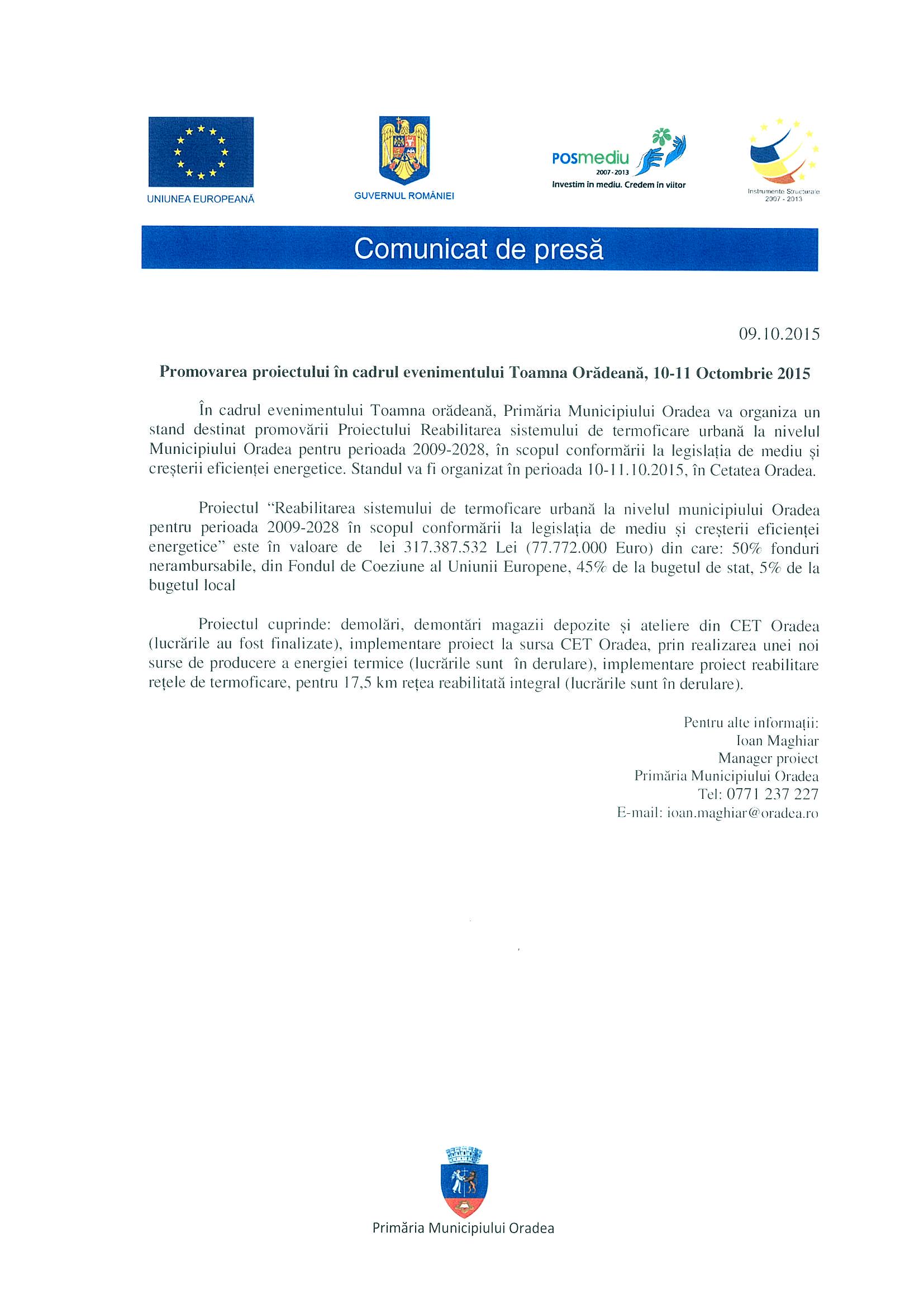 În cadrul evenimentului Toamna orădeană, Primăria Municipiului Oradea va organiza un stand destinat promovării Proiectului Reabilitarea sistemului de termoficare urbană la nivelul Municipiului Oradea pentru perioada 2009-2028, în scopul conformării la legislația de mediu și creșterii eficienței energetice. Standul va fi organizat în perioada 10-11.10.2015, în Cetatea Oradea.